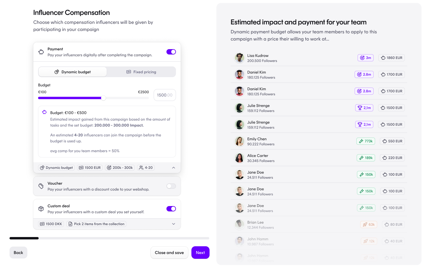 At the end of the campaign, the total budget is distributed across influencers based on the agreed price per influencer.