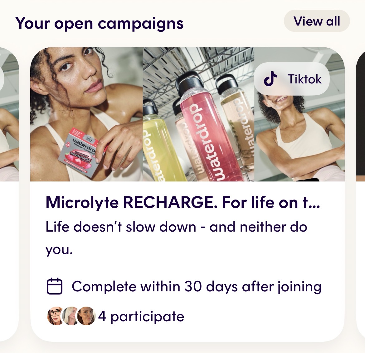 If you get selected to join a team: CONGRATULATIONS! You can now join any campaign that the brand might have. This is where the magic happens and where you can create synergies together. You will find all open campaigns in the app under "home". Here you will find a slider, what shows "Your open campaigns":