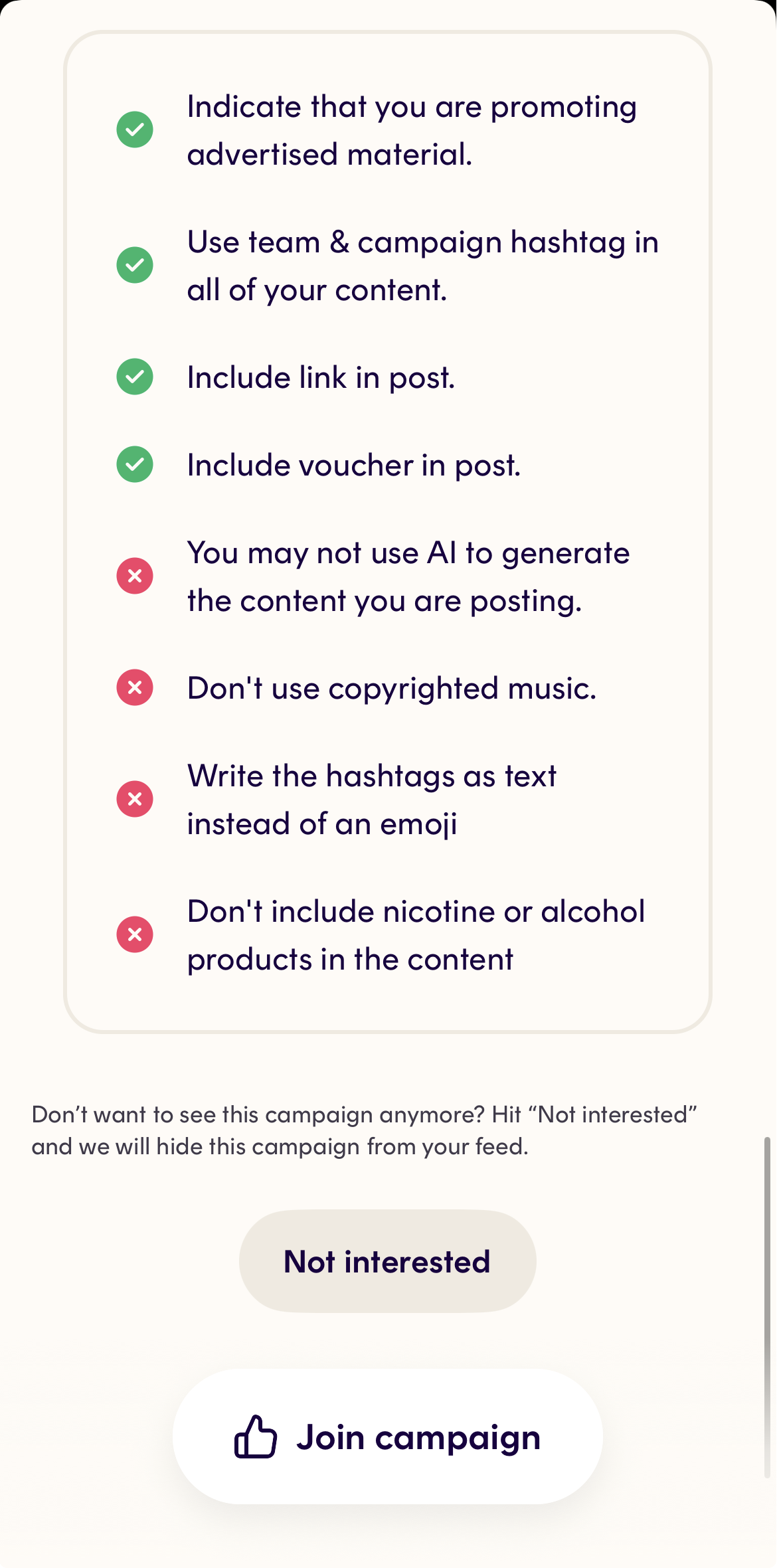 This part of the collaboration is very important. Everything you read in the brief, is legally a contract that will make you obligated to deliver what the brief dictates. Therefore we suggest you read it through narrowly and take your time to understand the assignment and the collaboration before joining. If you think everything looks good and you understand the obligations - you can press "Join campaign" at the bottom of the page: