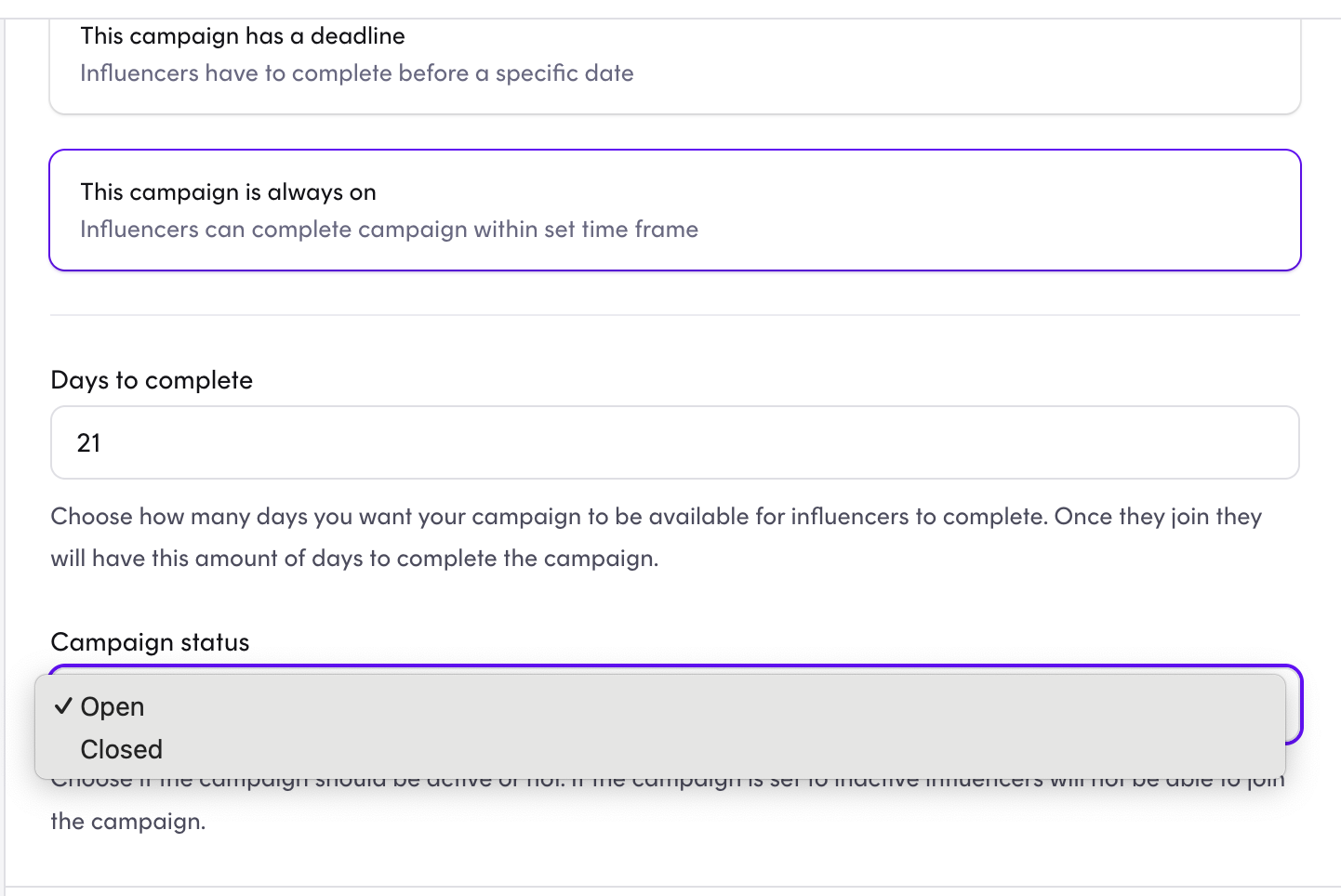 Here you should make sure, that the campaign is set to "This campaign is always on". If you scroll down a little on the same page, you should change the Status to "Closed"
