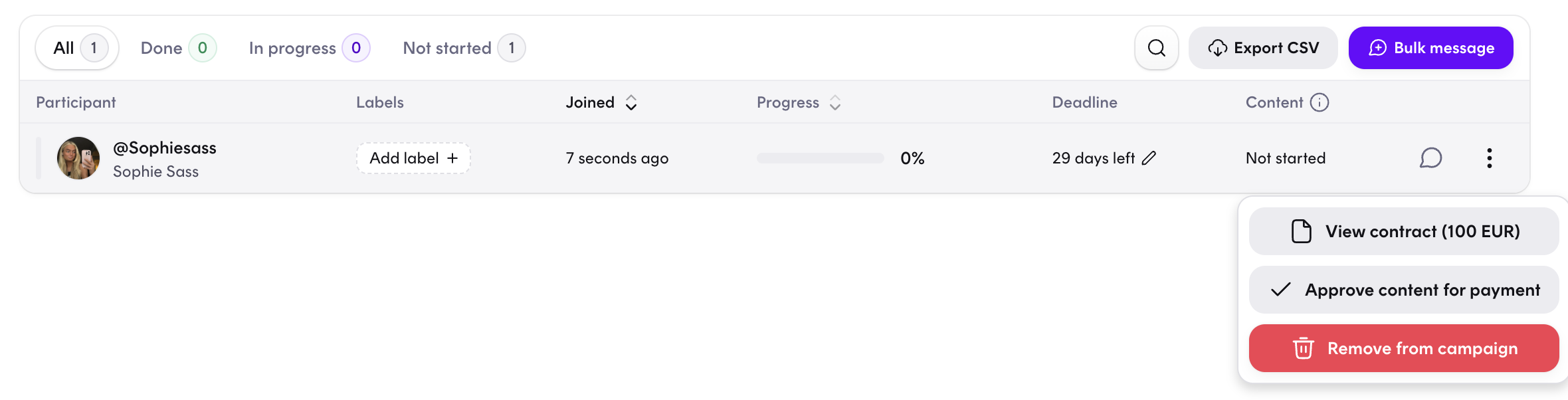 Start by locate the specific influencer you wish to remove and navigate to the right-hand side of their profile. Once there, you will find three dots, which upon clicking, will unveil a dropdown menu. Within this menu, you will encounter the option labeled "Remove from Campaign."
